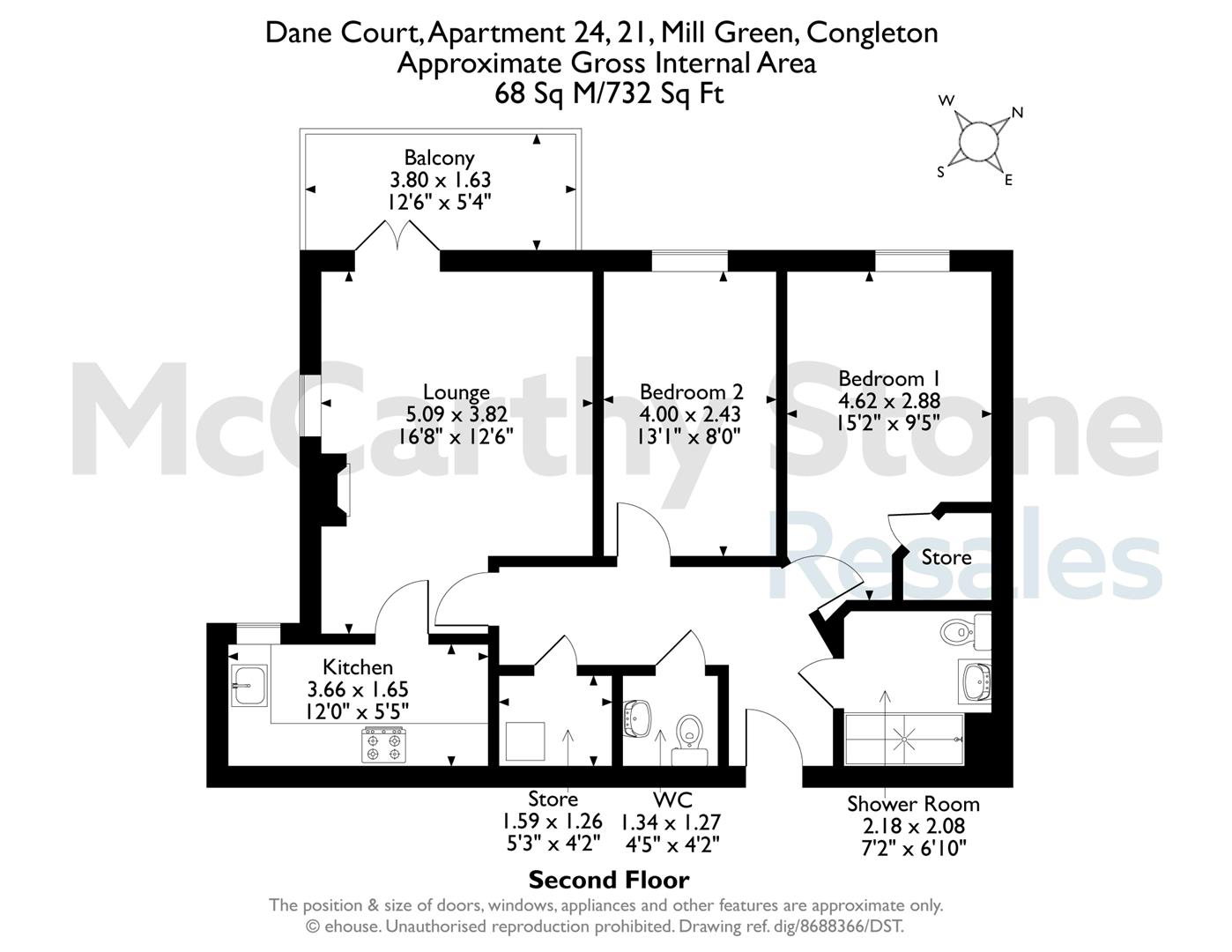 [summary] => A VERY WELL PRESENTED TWO BEDROOM SECOND FLOOR APARTMENT WITH WALK OUT BALCONY situated in Dane Court, part of McCarthy and Stone's Retirement Living range.