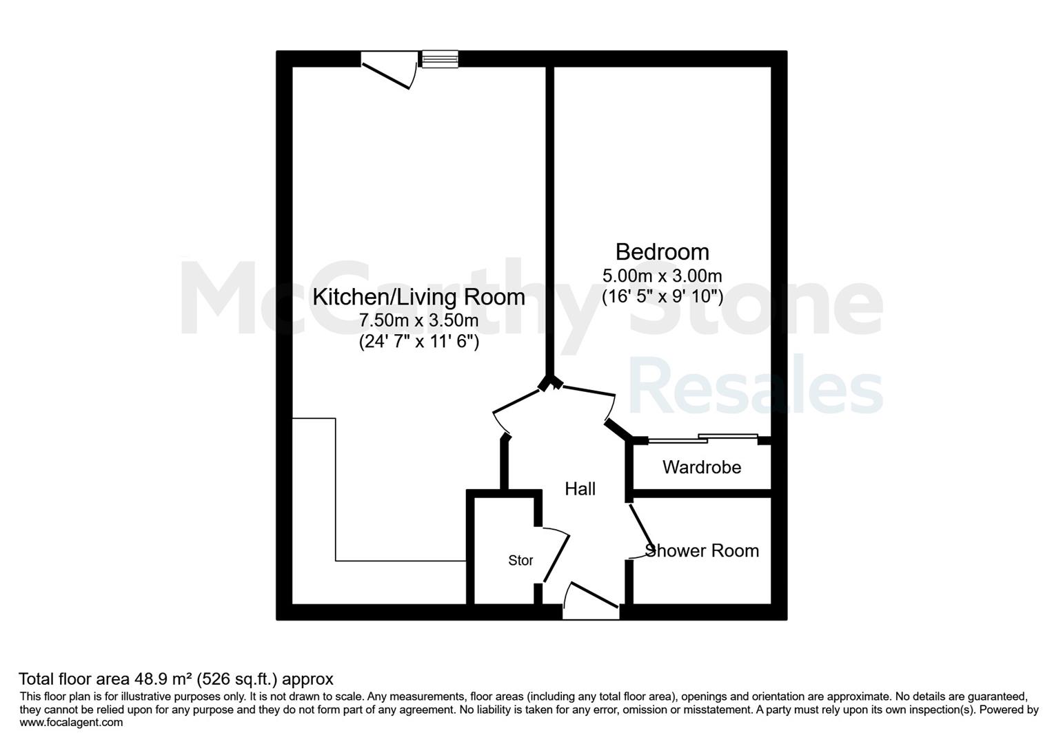 Front door with spy hole leads to the entrance hall. The 24-hour emergency response pull cord system, Illuminated light switches, smoke detector, wall mounted thermostat. From the hallway there is a door opening into a storage/airing cupboard. Further doors lead to the open plan living room/kitchen, bedroom and shower room.