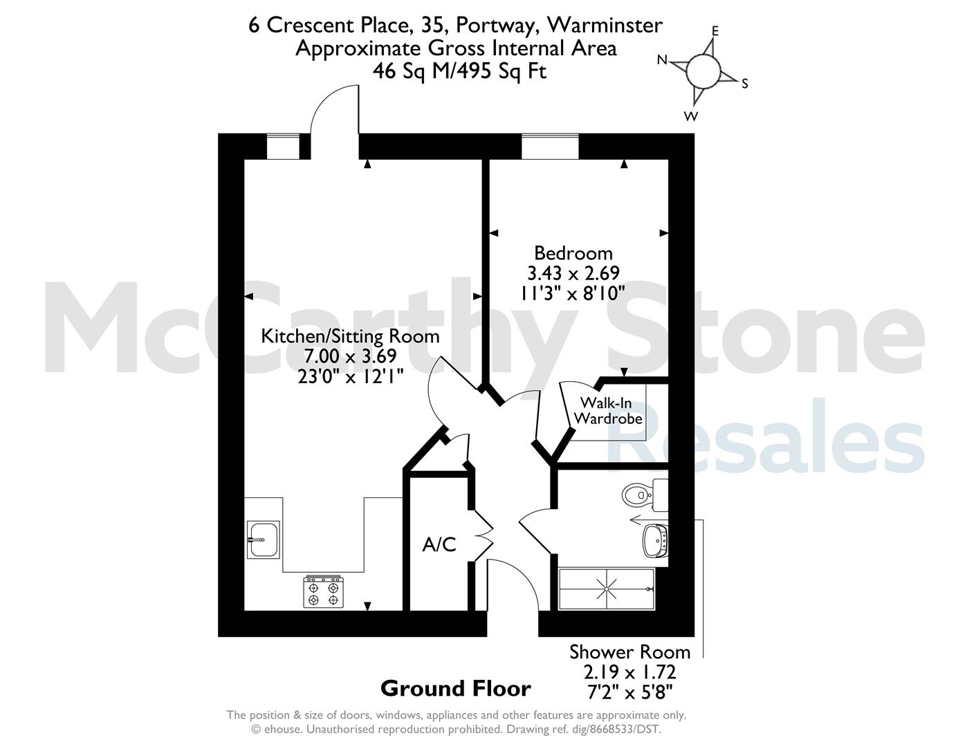 Located on the ground floor, and within easy reach of the communal facilities, no.6 offers an open plan kitchen/living room with direct access out on to a pretty patio area and part of the gardens. The double bedroom features a walk in wardrobe and the modern bathroom has a walk in shower.