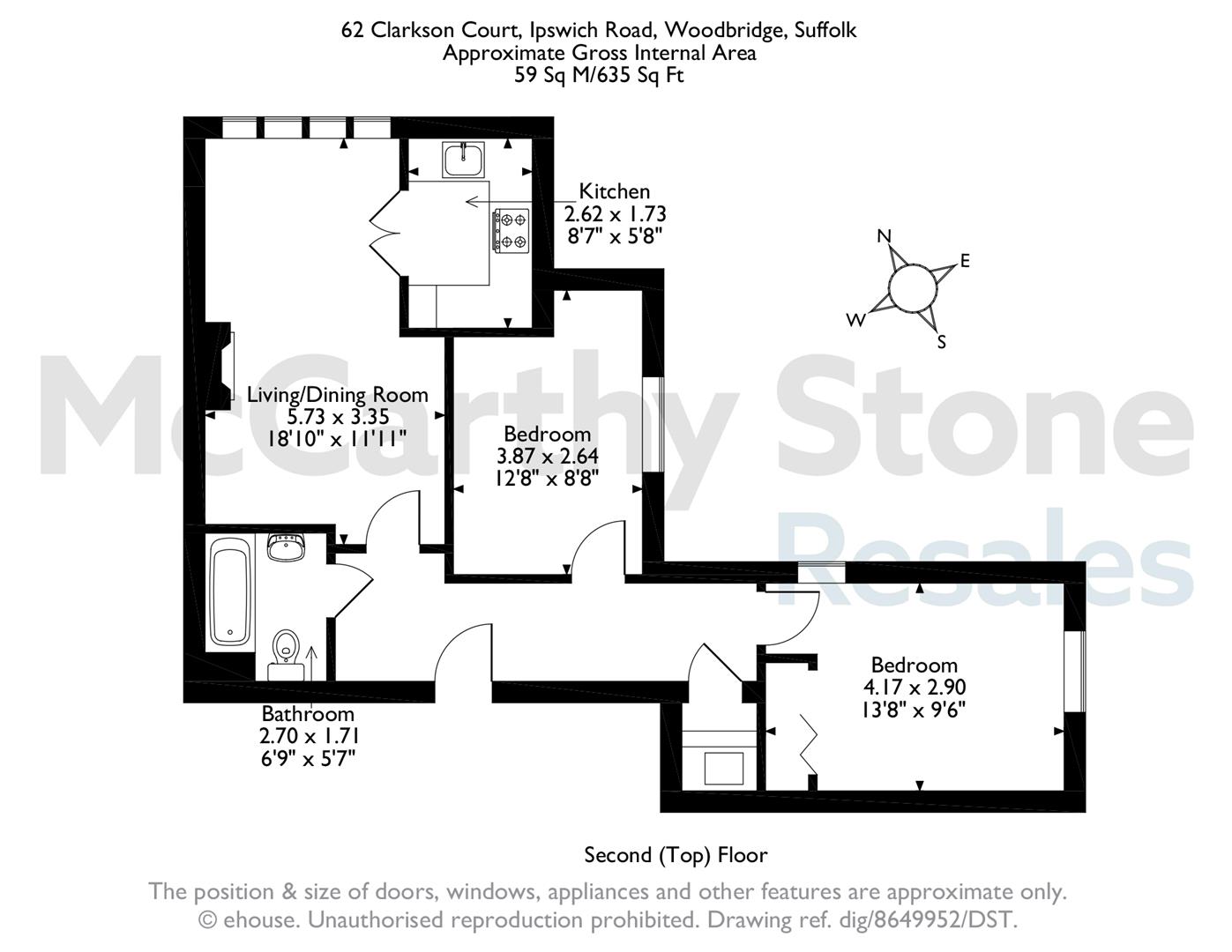 [summary] => A light and spacious TWO BEDROOM apartment situated on the SECOND (top) FLOOR. Kitchen with INTEGRATED APPLIANCES, spacious DOUBLE BEDROOMS, fitted bathroom suite, spacious living area with ample room for dining. Clarkson Court, a McCarthy Stone retirement development is nestled in Woodbridge and boasts a Homeowner's lounge where SOCIAL events take place and landscaped gardens.